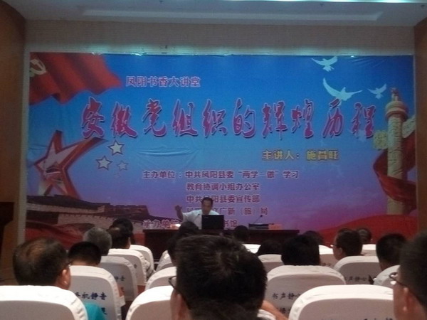 7月6日下午,鳳陽縣書香大講堂系列之“安徽黨組織的輝煌歷程”在縣圖書館報告廳舉行,鳳陽縣公司派員聆聽。講座由省委黨史研究室副主任施昌旺主講??h委“兩學(xué)一做”學(xué)習(xí)教育協(xié)調(diào)小組辦公室、縣委宣傳部、縣委講師組、縣文廣新(旅)局、縣圖書館相關(guān)負責(zé)人以及縣直各部門黨員干部聆聽了講座。