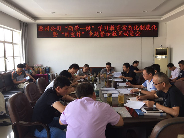 7月18日上午,滁州市公司召開全市“兩學(xué)一做” 學(xué)習(xí)教育常態(tài)化制度化暨“講重作”專題警示教育動員會,各縣(市)公司黨政負責(zé)人、市公司部門負責(zé)人以上人員及黨員、預(yù)備黨員、入黨積極分子參加了會議。會議由市公司副經(jīng)理、副局長王春雷同志主持。
