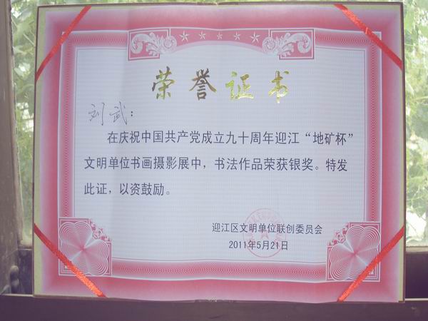 樅陽公司劉武同志書法作品獲銀獎
