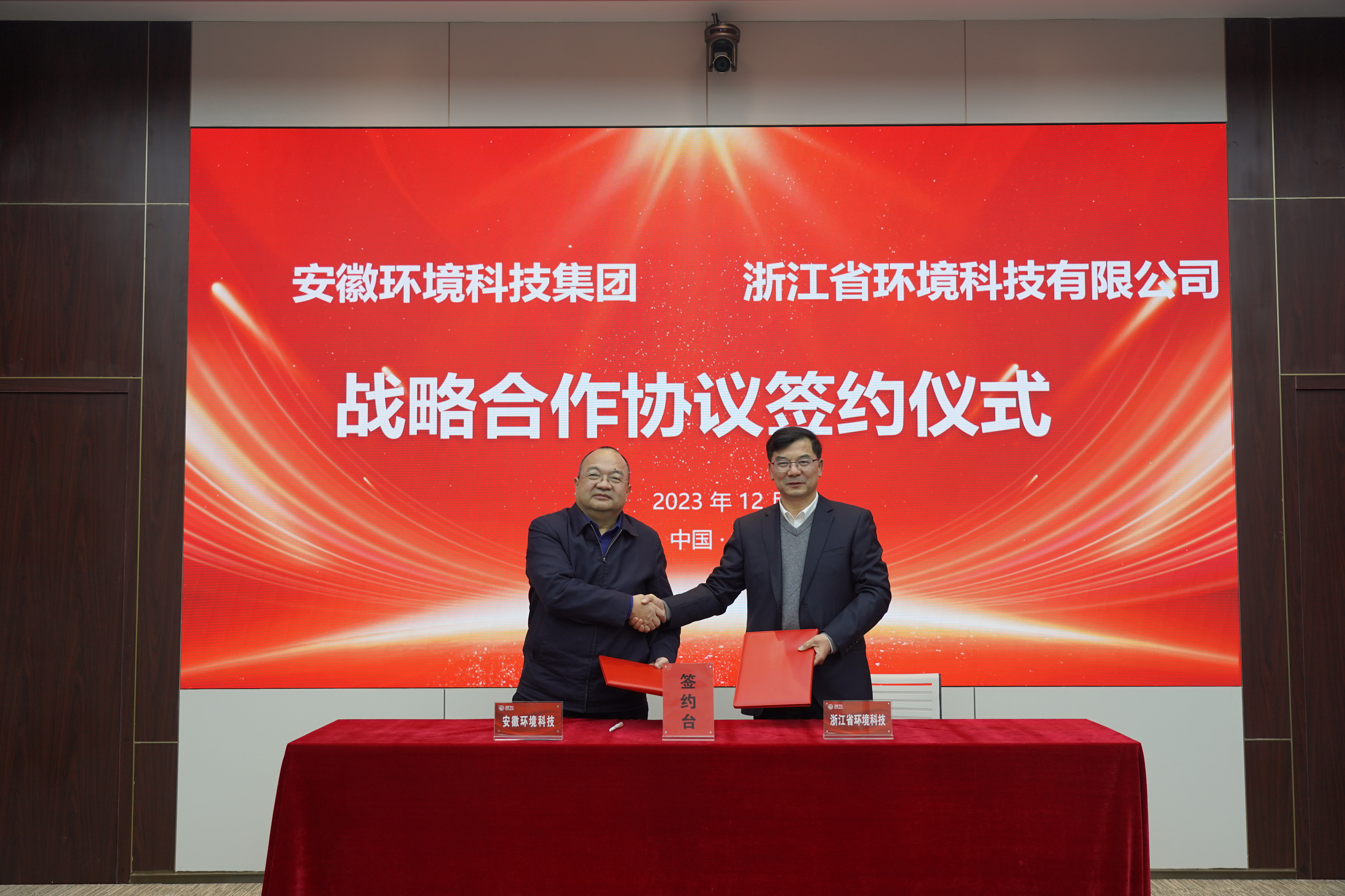 浙江省環(huán)境科技有限公司黨委書記、董事長韋彥斐,安徽環(huán)境科技集團(tuán)黨委書記、董事長方降龍代表雙方簽訂戰(zhàn)略合作協(xié)議。