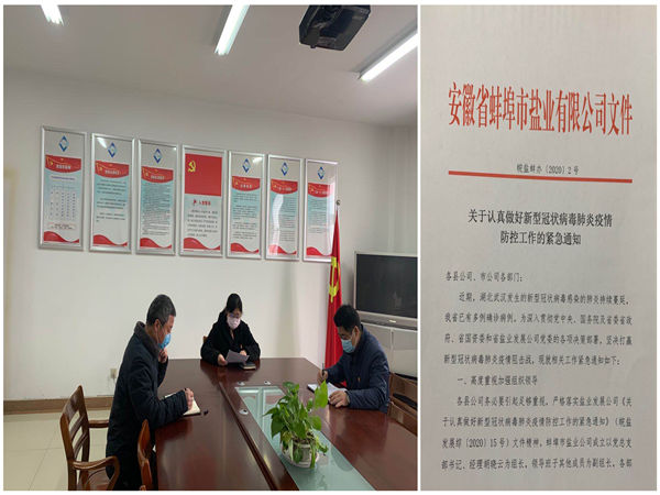 1月27日蚌埠鹽業(yè)公司黨總支召開了緊急會議,深入貫徹中央和上級黨委有關(guān)疫情防控的各項決策部署,制定了《關(guān)于認真做好新型冠狀病毒肺炎疫情防控工作的緊急通知》(皖鹽蚌辦〔2020〕2號)。成立了以黨總支書記、經(jīng)理為組長,總支班子成員為副組長,各部門主要負責(zé)人為成員的新型冠狀病毒防控工作領(lǐng)導(dǎo)小組,要求市縣公司全方位積極做好疫情防控,立即啟動特殊時期食鹽供應(yīng)緊急預(yù)案,市縣公司班子成員以及保障食鹽供應(yīng)的相關(guān)業(yè)務(wù)崗位人員,要第一時間全部到崗就位,堅守疫情防控第一線,堅守食鹽保障供應(yīng)第一線,實行24小時領(lǐng)導(dǎo)帶班值班制,抗疫情,保供應(yīng),眾志成城,義不容辭。