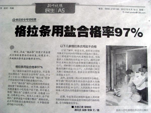 昨日,阜城“格拉條”經(jīng)營戶用鹽情況專項檢查整治行動結(jié)束,結(jié)果顯示:阜城格拉條用鹽合格率為97%。