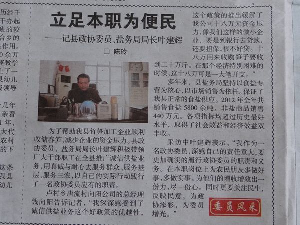 為了幫助我縣竹筍加工企業(yè)順利收儲(chǔ)春筍,減少企業(yè)的資金壓力。縣政協(xié)委員、鹽務(wù)局局長(zhǎng)葉建輝積極帶領(lǐng)廣大干部職工在全縣推廣誠(chéng)信供鹽業(yè)務(wù),用真誠(chéng)與耐心去服務(wù)群眾、服務(wù)基層、服務(wù)三農(nóng),以自己的實(shí)際行動(dòng)踐行了一名政協(xié)委員應(yīng)有的職責(zé)。