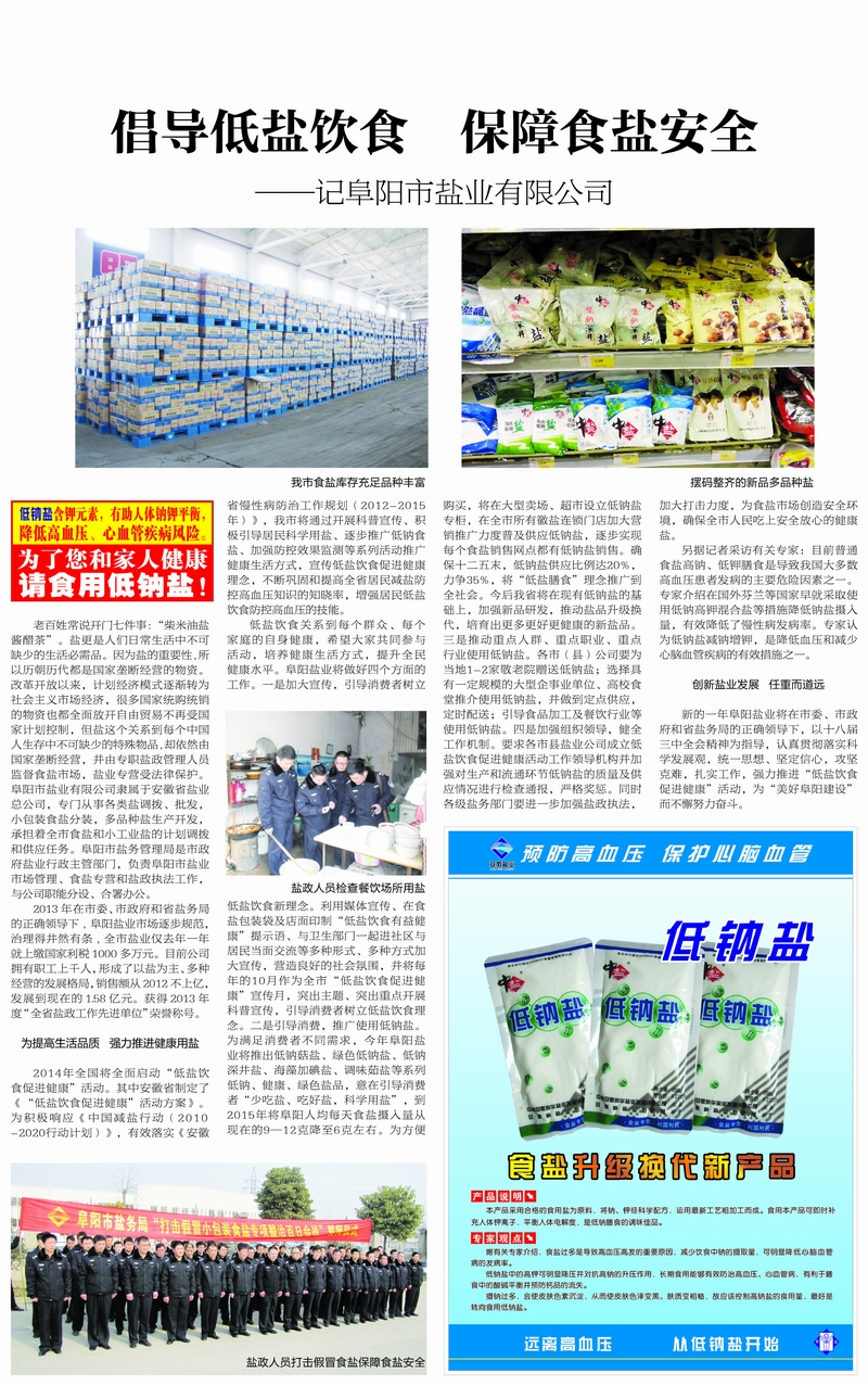 低鹽飲食關(guān)系到每個(gè)群眾、每個(gè)家庭的自身健康,希望大家共同參與活動(dòng),培養(yǎng)健康生活方式,提升全民健康水平。阜陽鹽業(yè)將做好四個(gè)方面的工作。一是加大宣傳,引導(dǎo)消費(fèi)者樹立低鹽飲食新理念。利用媒體宣傳、在食鹽包裝袋及店面印制“低鹽飲食有益健康”提示語、與衛(wèi)生部門一起進(jìn)社區(qū)與居民當(dāng)面交流等多種形式、多種方式加大宣傳,營造良好的社會(huì)氛圍,并將每年的10月作為全市“低鹽飲食促進(jìn)健康”宣傳月,突出主題、突出重點(diǎn)開展科普宣傳,引導(dǎo)消費(fèi)者樹立低鹽飲食理念。二是引導(dǎo)消費(fèi),推廣使用低鈉鹽。為滿足消費(fèi)者不同需求,今年阜陽鹽業(yè)將推出低鈉菇鹽、綠色低鈉鹽、低鈉深井鹽、海藻加碘鹽、調(diào)味菇鹽等系列低鈉、健康、綠色鹽品,意在引導(dǎo)消費(fèi)者“少吃鹽、吃好鹽,科學(xué)用鹽”,到2015年將阜陽人均每天食鹽攝入量從現(xiàn)在的9—12克降至6克左右。為方便購買,將在大型賣場、超市設(shè)立低鈉鹽專柜,在全市所有徽鹽連鎖門店加大營銷推廣力度普及供應(yīng)低鈉鹽,逐步實(shí)現(xiàn)每個(gè)食鹽銷售網(wǎng)點(diǎn)都有低鈉鹽銷售。確保十二五末,低鈉鹽供應(yīng)比例達(dá)20%,力爭35%,將“低鹽膳食”理念推廣到全社會(huì)。今后我市將在現(xiàn)有低鈉鹽的基礎(chǔ)上,加強(qiáng)新品研發(fā),推動(dòng)鹽品升級換代,培育出更多更好更健康的新鹽品。三是推動(dòng)重點(diǎn)人群、重點(diǎn)職業(yè)、重點(diǎn)行業(yè)使用低鈉鹽。各市(縣)公司要為當(dāng)?shù)?-2家敬老院贈(zèng)送低鈉鹽;選擇具有一定規(guī)模的大型企事業(yè)單位、高校食堂推介使用低鈉鹽,并做到定點(diǎn)供應(yīng),定時(shí)配送;引導(dǎo)食品加工及餐飲行業(yè)等使用低鈉鹽。四是加強(qiáng)組織領(lǐng)導(dǎo),健全工作機(jī)制。要求各市(縣)鹽業(yè)公司成立低鹽飲食促進(jìn)健康活動(dòng)工作領(lǐng)導(dǎo)機(jī)構(gòu)并加強(qiáng)對生產(chǎn)和流通環(huán)節(jié)低鈉鹽的質(zhì)量及供應(yīng)情況進(jìn)行檢查通報(bào),嚴(yán)格獎(jiǎng)懲。同時(shí)各級鹽務(wù)部門要進(jìn)一步加強(qiáng)鹽政執(zhí)法,加大打擊力度,為食鹽市場創(chuàng)造安全環(huán)境,確保全市人民吃上安全放心的健康鹽。