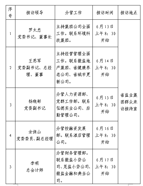 根據(jù)工作安排,現(xiàn)就省鹽業(yè)集團領(lǐng)導(dǎo)班子成員6月份接待省鹽業(yè)系統(tǒng)職工群眾來訪安排公示如下: