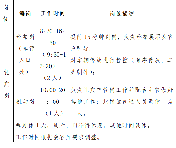 (3)客服崗:選派的客服人員必須經(jīng)過專業(yè)技能培訓(xùn),身體健康,品行良好,無違法違紀(jì)犯罪前科,具有初中以上文化程度,年齡在21至45周歲、身高1.65米以上。對(duì)現(xiàn)場的客戶接待服務(wù)工作有一定的意識(shí)。