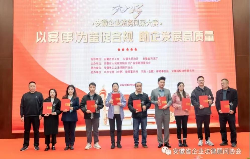 2023年11月15日上午,由安徽省總工會、安徽省民政廳、安徽省司法廳指導,安徽省人民政府國有資產(chǎn)監(jiān)督管理委員會主辦,安徽省企業(yè)法律顧問協(xié)會承辦的“2023年安徽企業(yè)法務風采大賽”在合肥成功舉辦。本次大賽主題是“以案(事)為鑒促合規(guī),助企發(fā)展高質(zhì)量”,共征集征文、PPT、微視頻等法治作品155篇(部)。