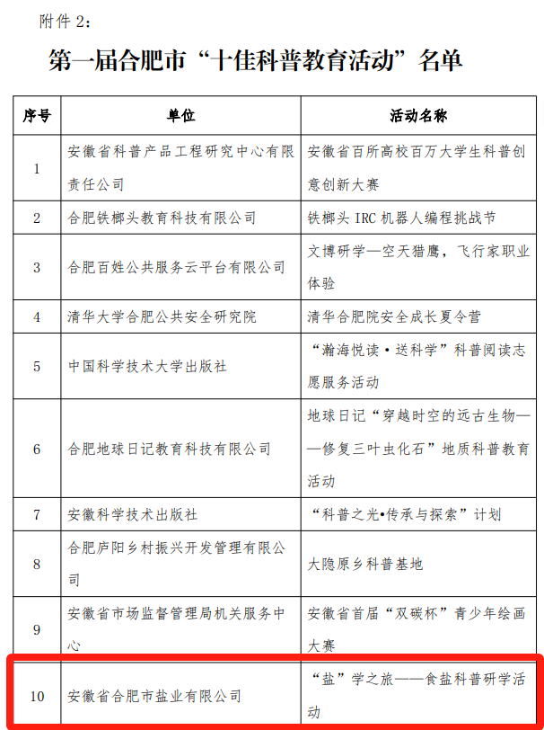 近日,由合肥市科普產業(yè)聯(lián)盟舉辦的第一屆合肥市“十佳展品”“十佳科普教育活動”“科普產業(yè)領軍人物”評選結果公布,合肥鹽業(yè)“鹽”學之旅——食鹽科普研學活動榮膺第一屆合肥市“十佳科普教育活動”。